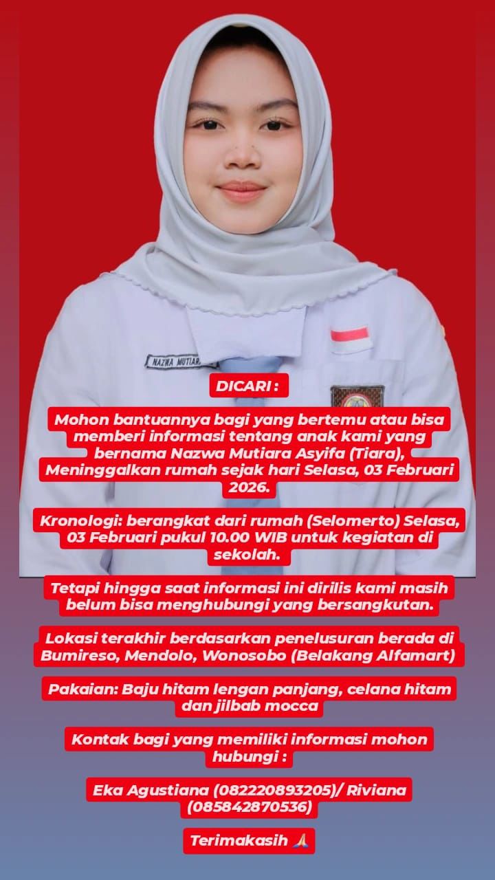 Wonosobo| HotNewsInvestigasi.Com - Hilangnya seorang pelajar perempuan di Kabupaten Wonosobo memunculkan sejumlah pertanyaan yang hingga kini belum terjawab. Nazwa Mutiara…