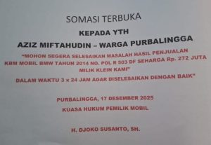 Somasi tertanggal 17 Desember 2025 itu disampaikan kuasa hukum Bambang Irawan, H. Djoko Susanto, SH, kepada Aziz M, warga Purbalingga. Dalam somasi tersebut, pihak yang bersangkutan diberikan tenggat waktu 3 x 24 jam untuk menyelesaikan kewajiban pembayaran secara kekeluargaan sebelum ditempuh langkah hukum lanjutan.