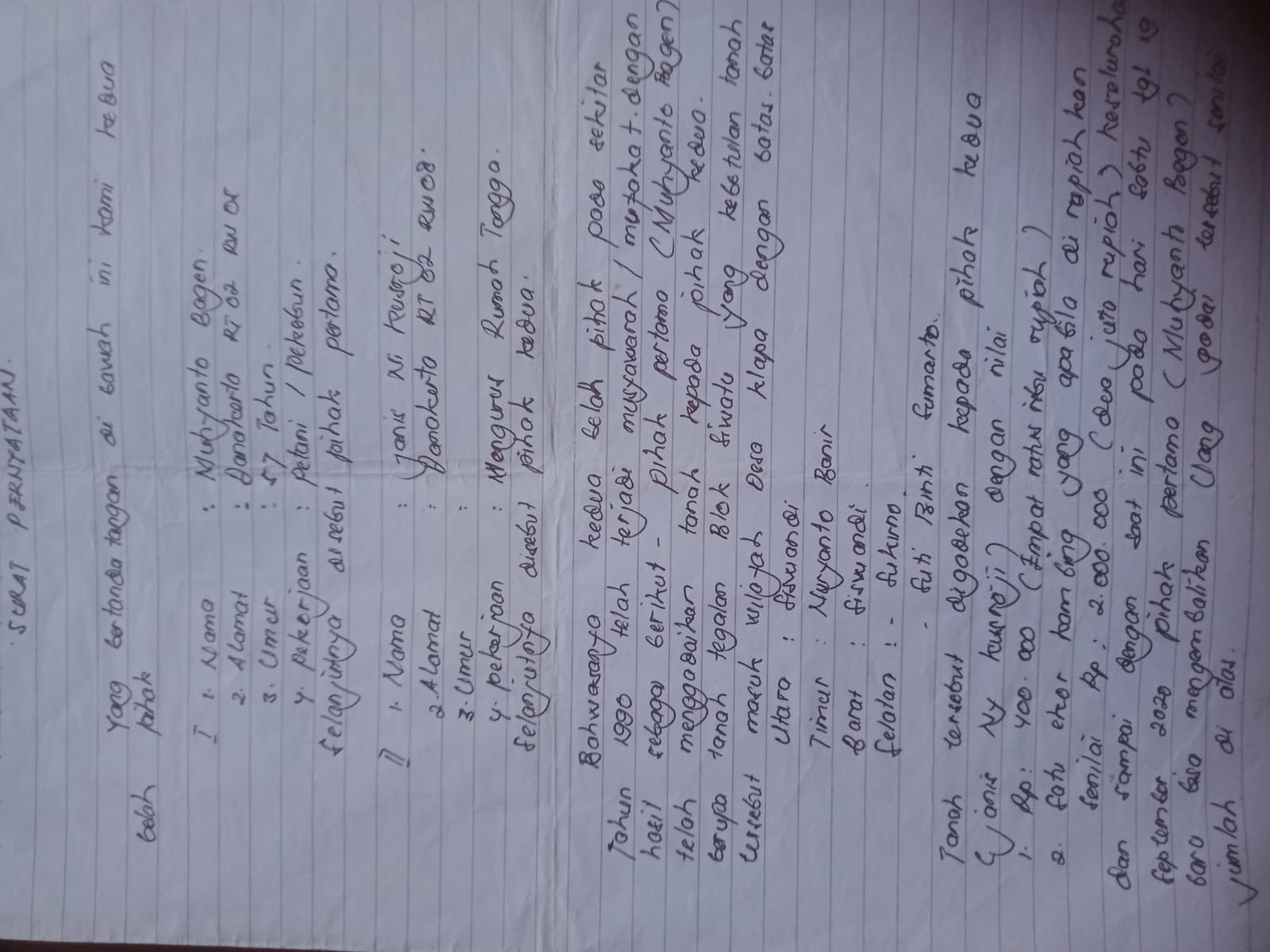 Kesepakatan itu dituangkan dalam surat pernyataan bermaterai yang disaksikan tujuh orang, terdiri dari perangkat desa serta keluarga pihak Janis. Namun setelah kewajiban dipenuhi, Muhyanto justru mengetahui bahwa tanah miliknya telah beralih nama dan tercatat atas nama pihak lain. Proses balik nama tersebut diduga dilakukan tanpa persetujuan maupun sepengetahuan dirinya sebagai pemilik sah.